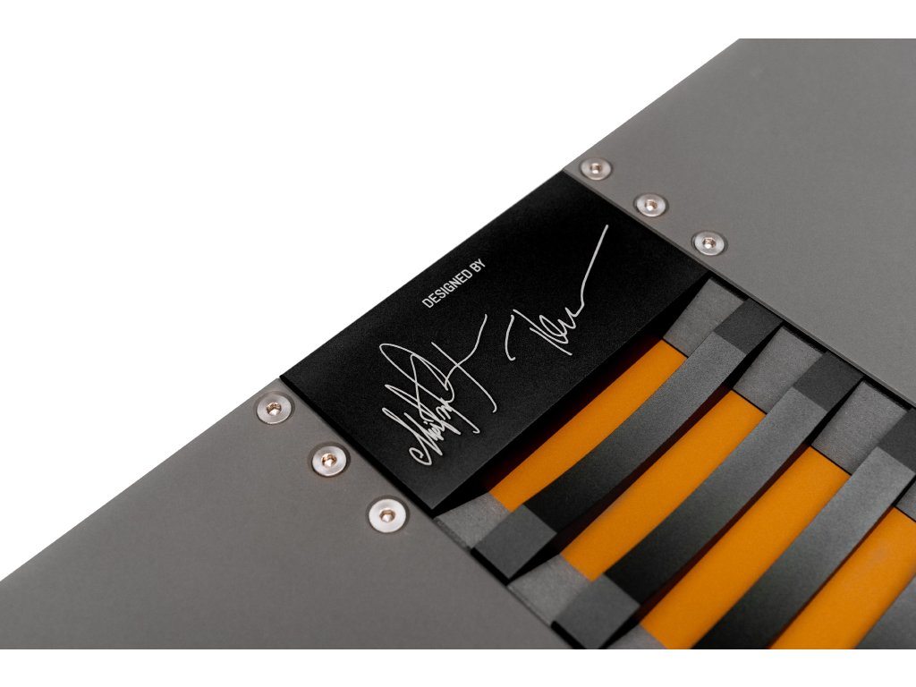 Spodní deska kombinuje měděnou plátu, těžký kompaktní laminát a spodní titanovou vrstvu. Tato sendvičová struktura minimalizuje rezonance a podporuje přirozený, organický charakter zvuku.